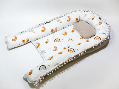 De Babynest is gemaakt van zachte katoenen stof en heeft opstaande buitenranden die stevig genoeg zijn om te voorkomen dat je baby van het nestje afrolt. De onderzijde van de Babynest bevat een zacht en stevig schuimmatras.